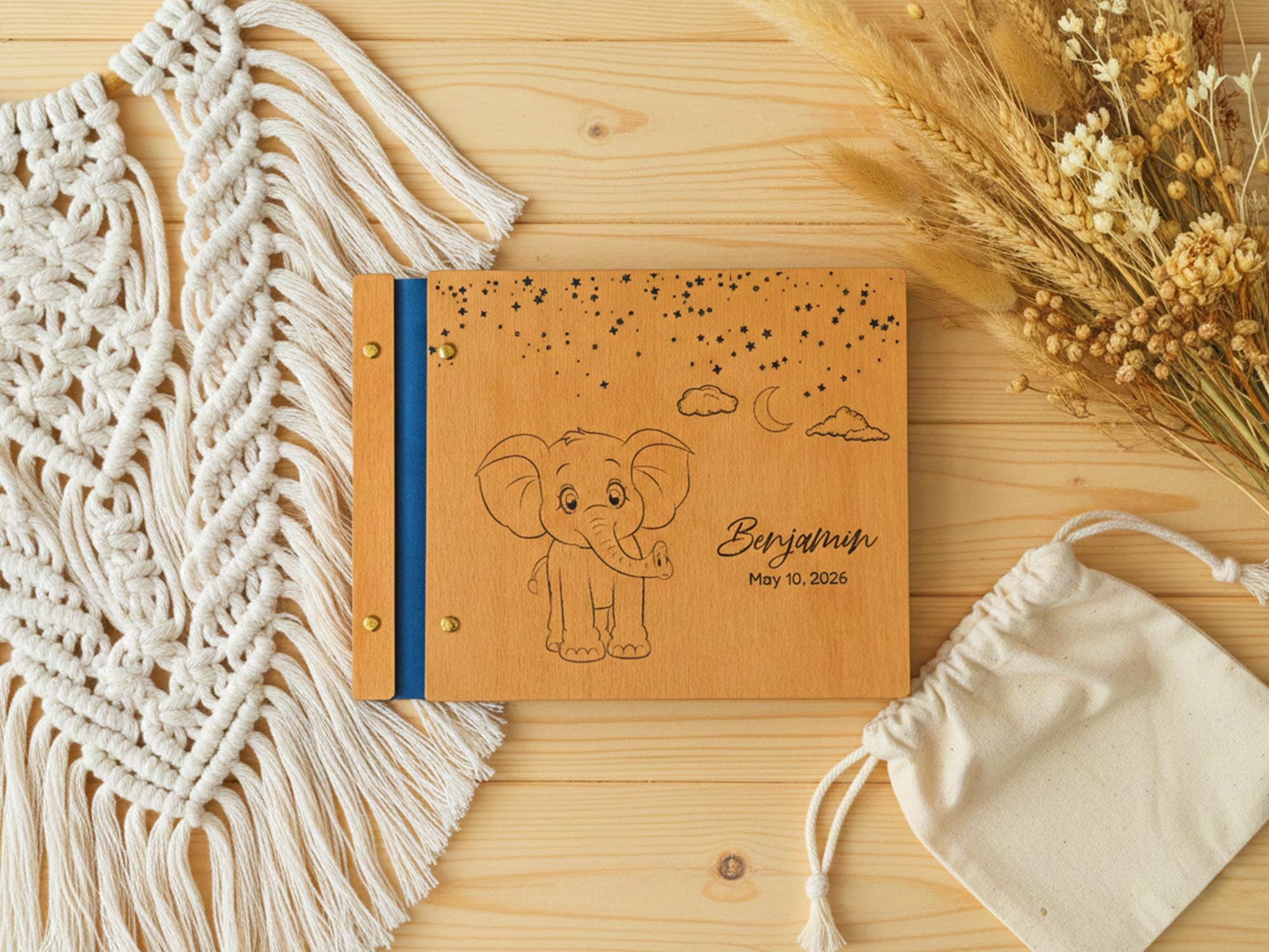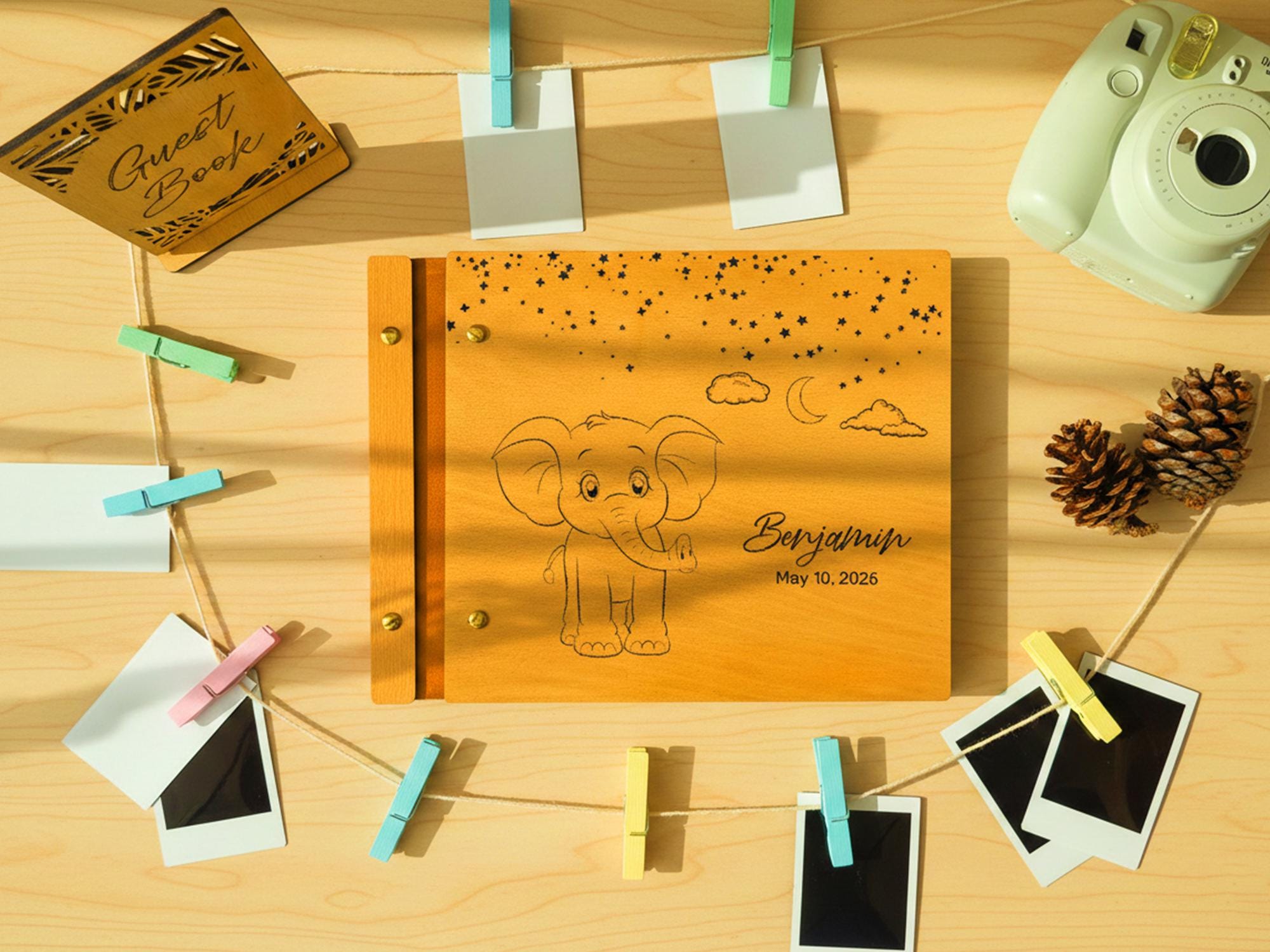 Celebrate your little one’s arrival with this handcrafted wooden baby memory book. Featuring engraved sweet elephant figure, your child’s name, and a special date, this photo album makes a timeless k…
