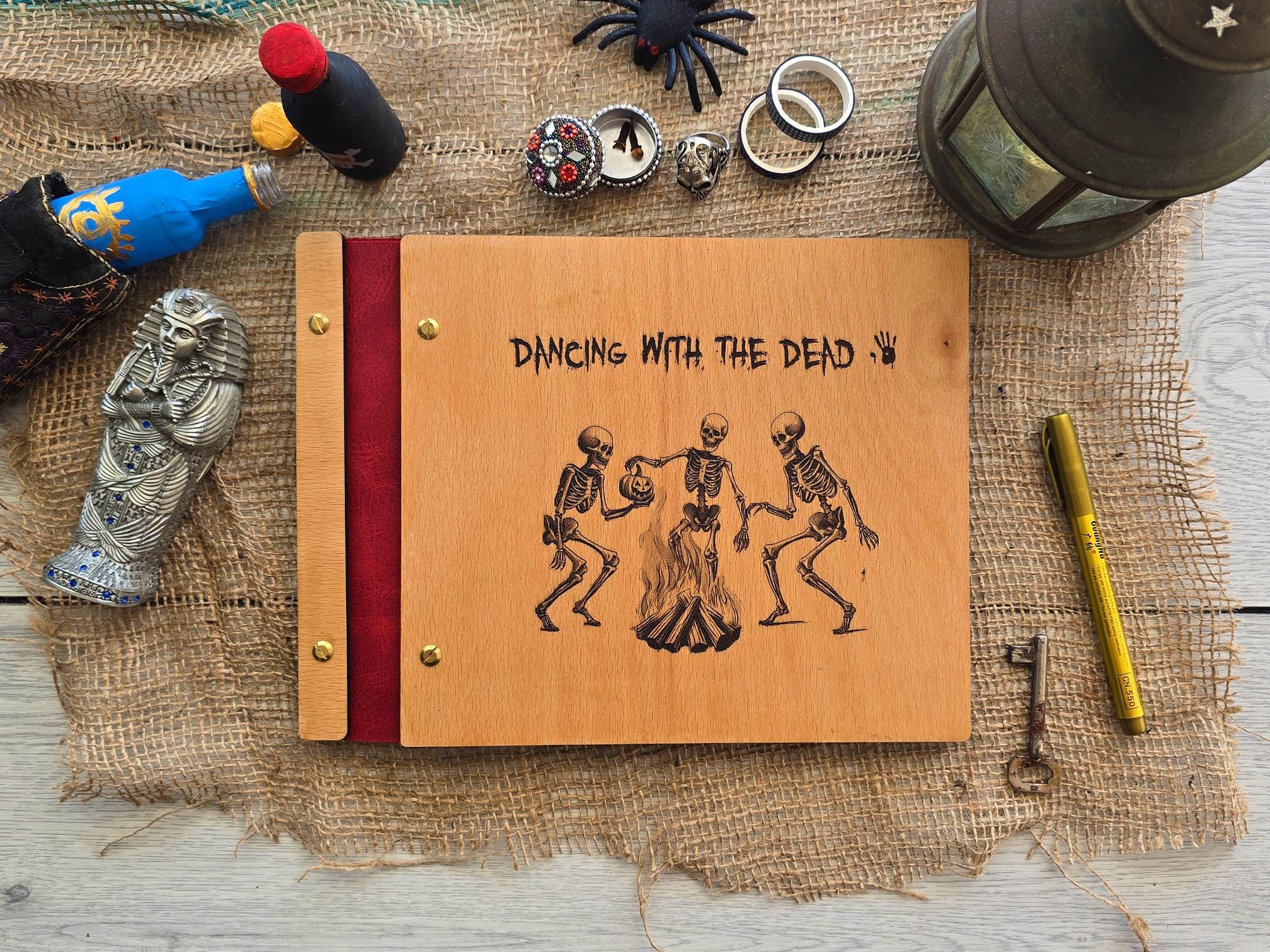 Capture your spooky memories with this handmade Halloween photo album & scrapbook. Featuring a unique wooden cover engraved with dancing skeletons and the phrase “Dancing with the Dead”, it’s the perfect keepsake for Halloween lovers.