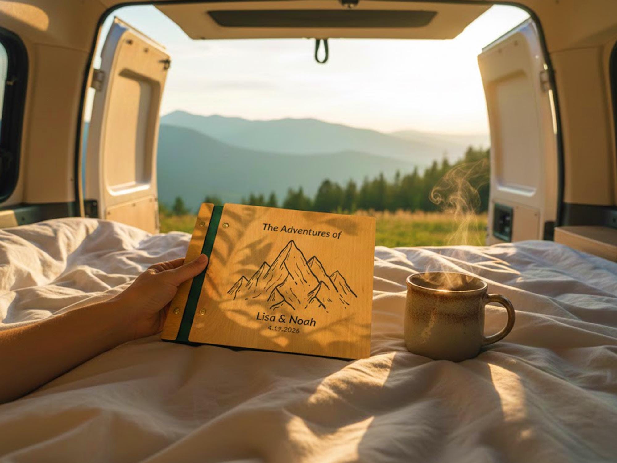 Start your story with this classic “The Adventures of…” Guest Book. Handmade with a solid wooden cover (from natural Birch or Beech) and a genuine leather spine, this photo album features a timeless, clean-line mountain graphic, personalized to tell your unique story. 🏔️📖