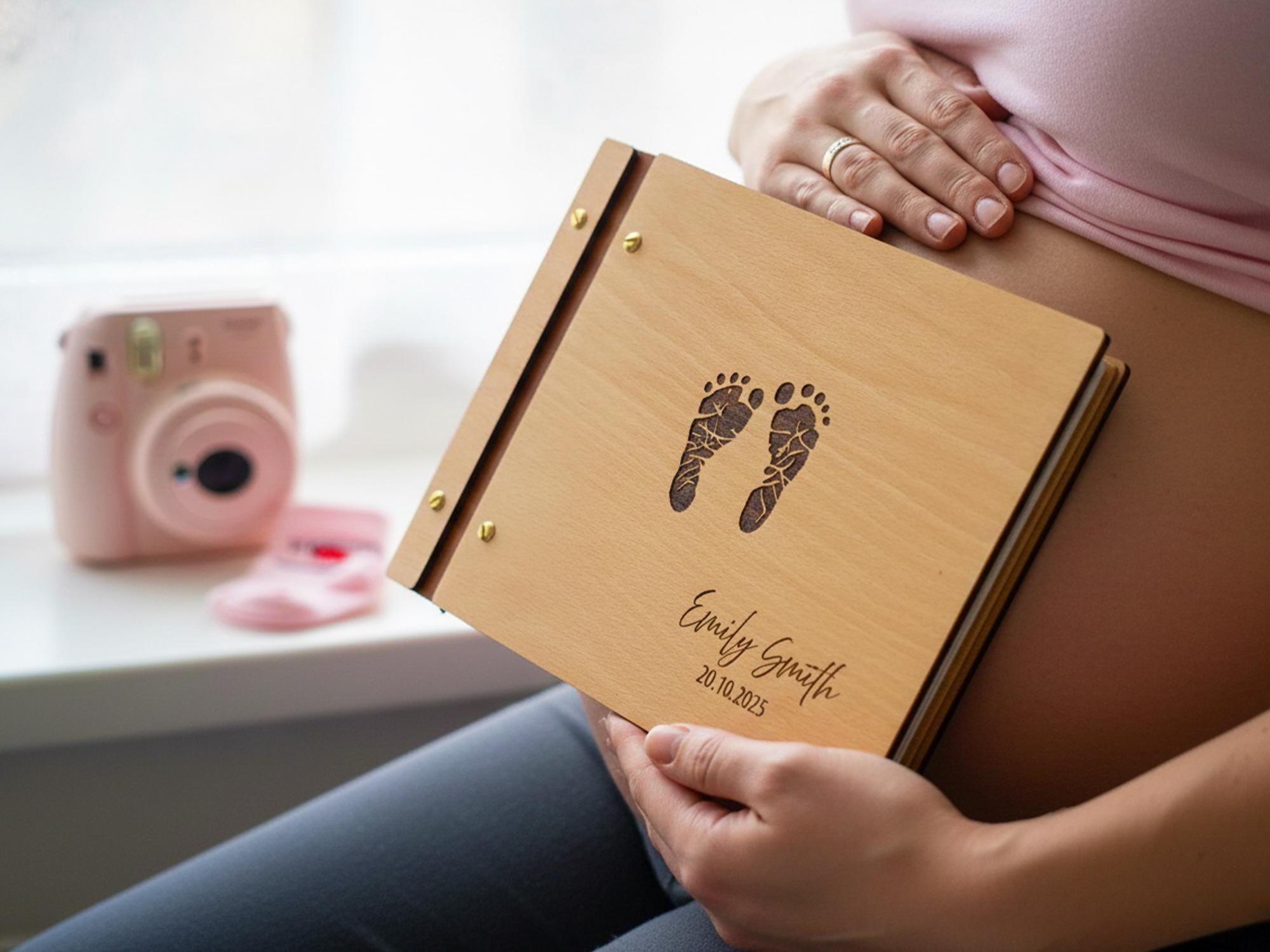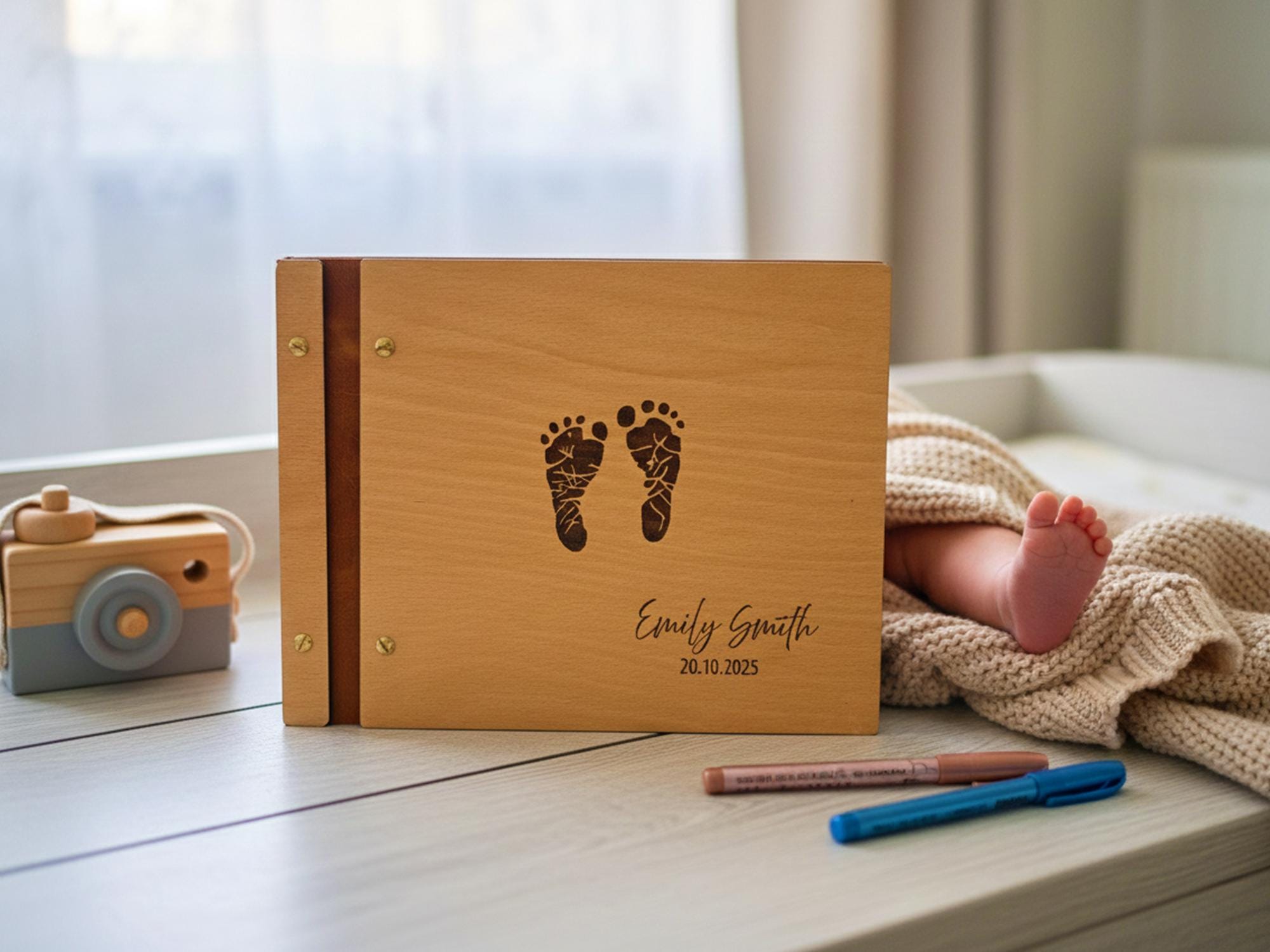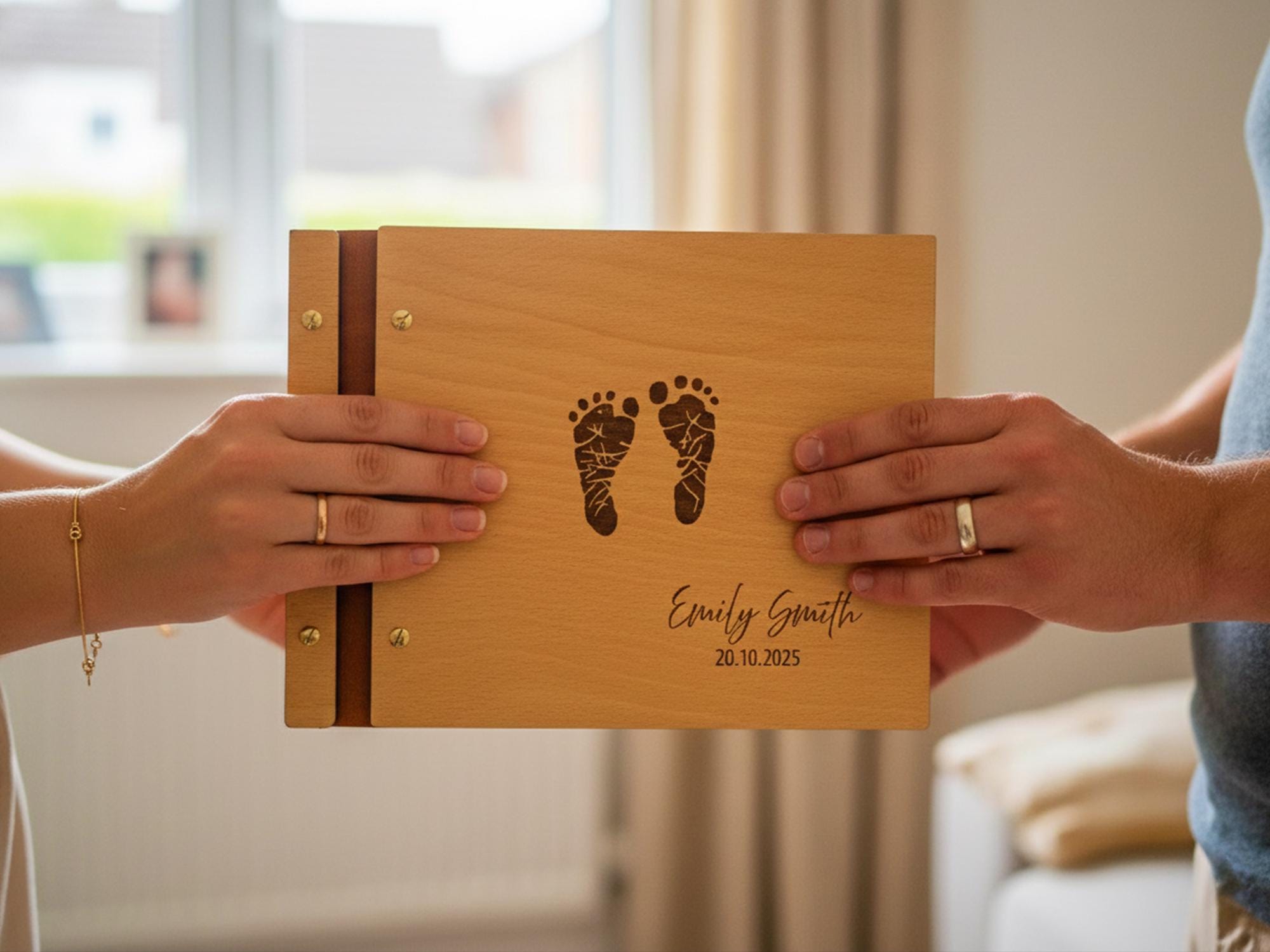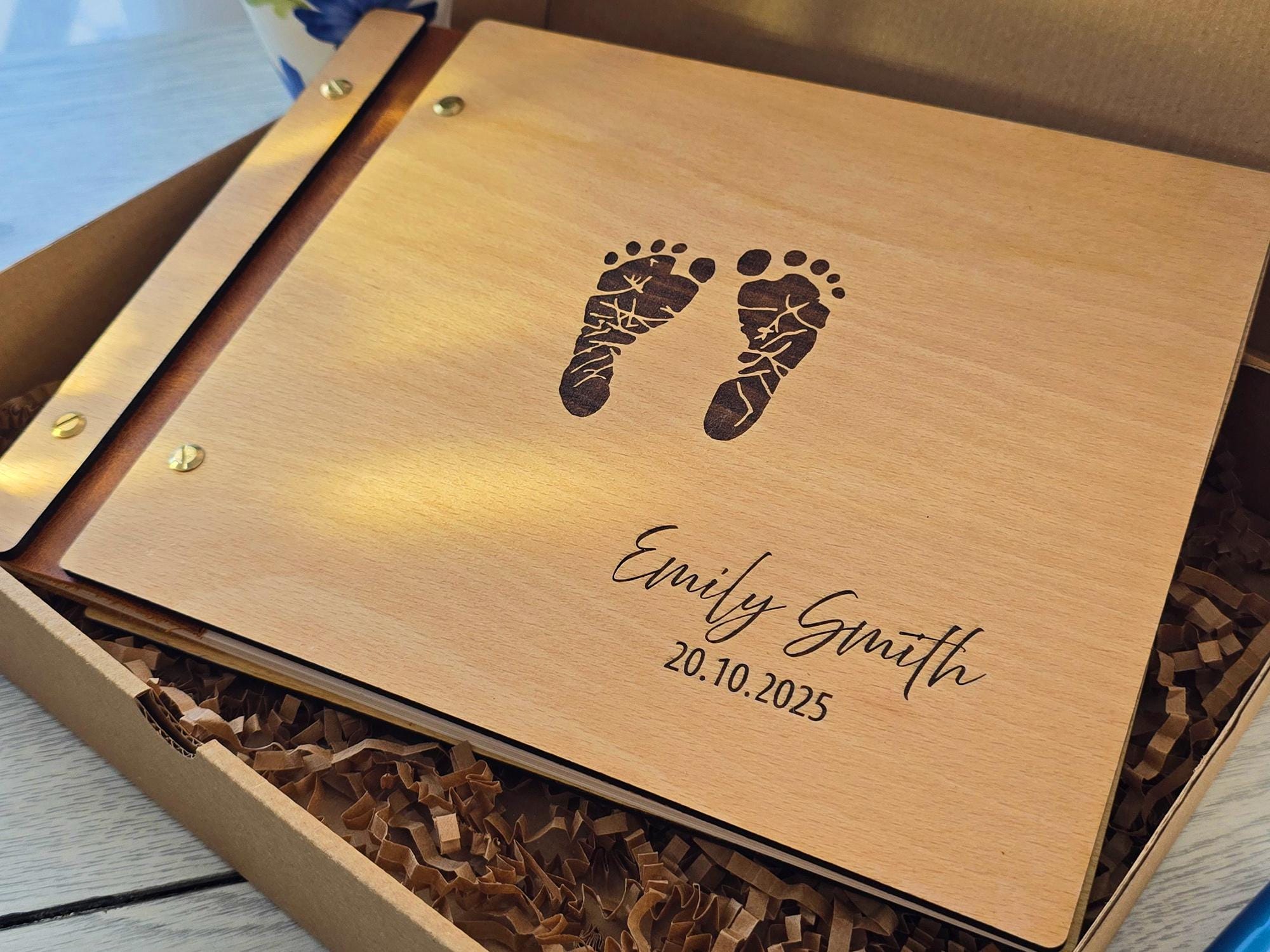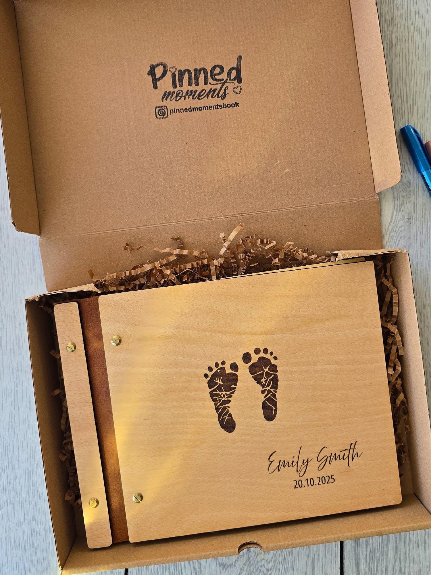Celebrate your little one’s arrival with this handcrafted wooden baby memory book. Featuring engraved baby footprints, your child’s name, and a special date, this photo album makes a timeless keepsake to treasure forever. Perfect as a baby shower gift, newborn present, or first birthday keepsake, it’s designed to hold your family’s most precious memories.