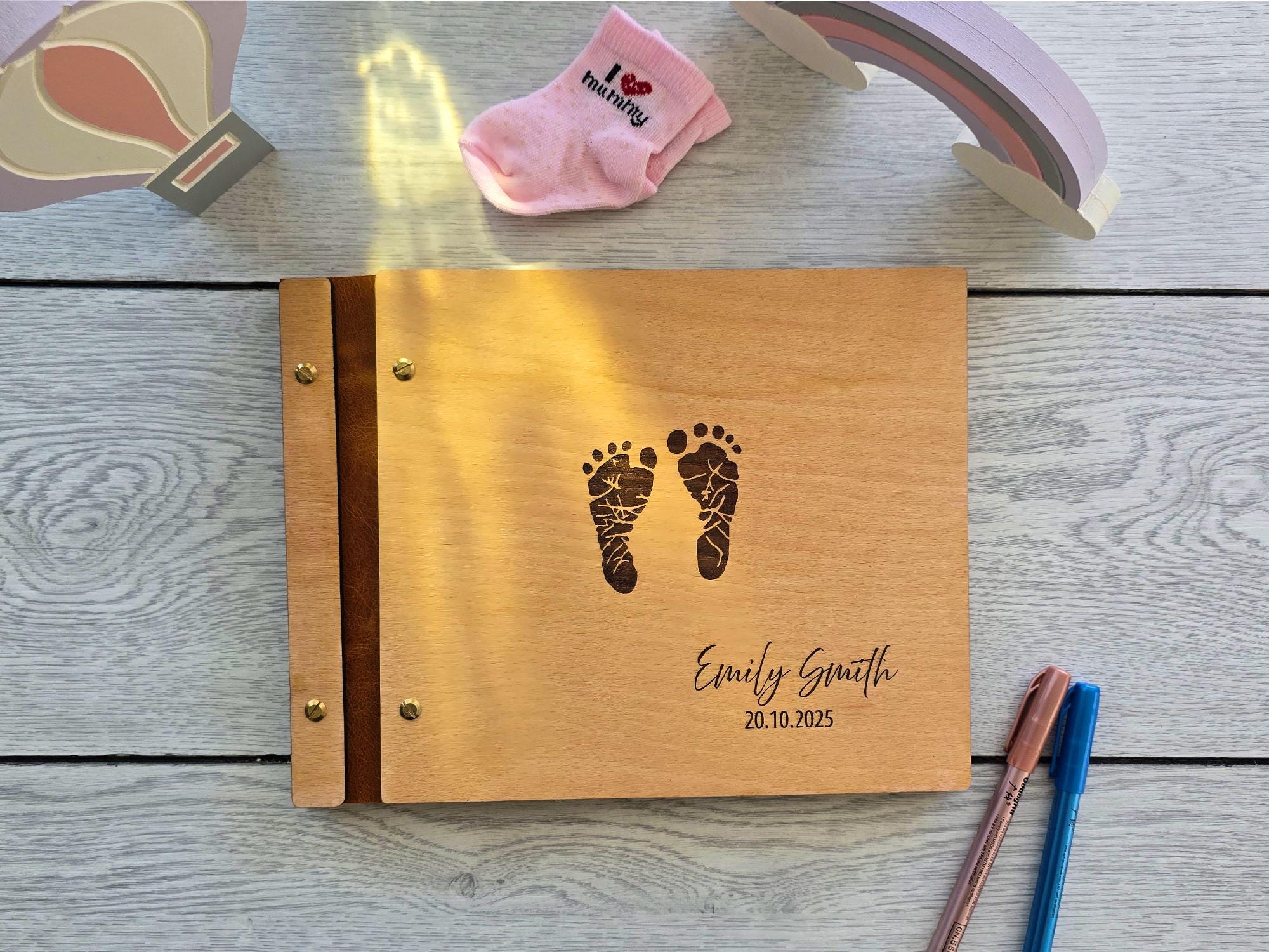 Celebrate your little one’s arrival with this handcrafted wooden baby memory book. Featuring engraved baby footprints, your child’s name, and a special date, this photo album makes a timeless keepsak…