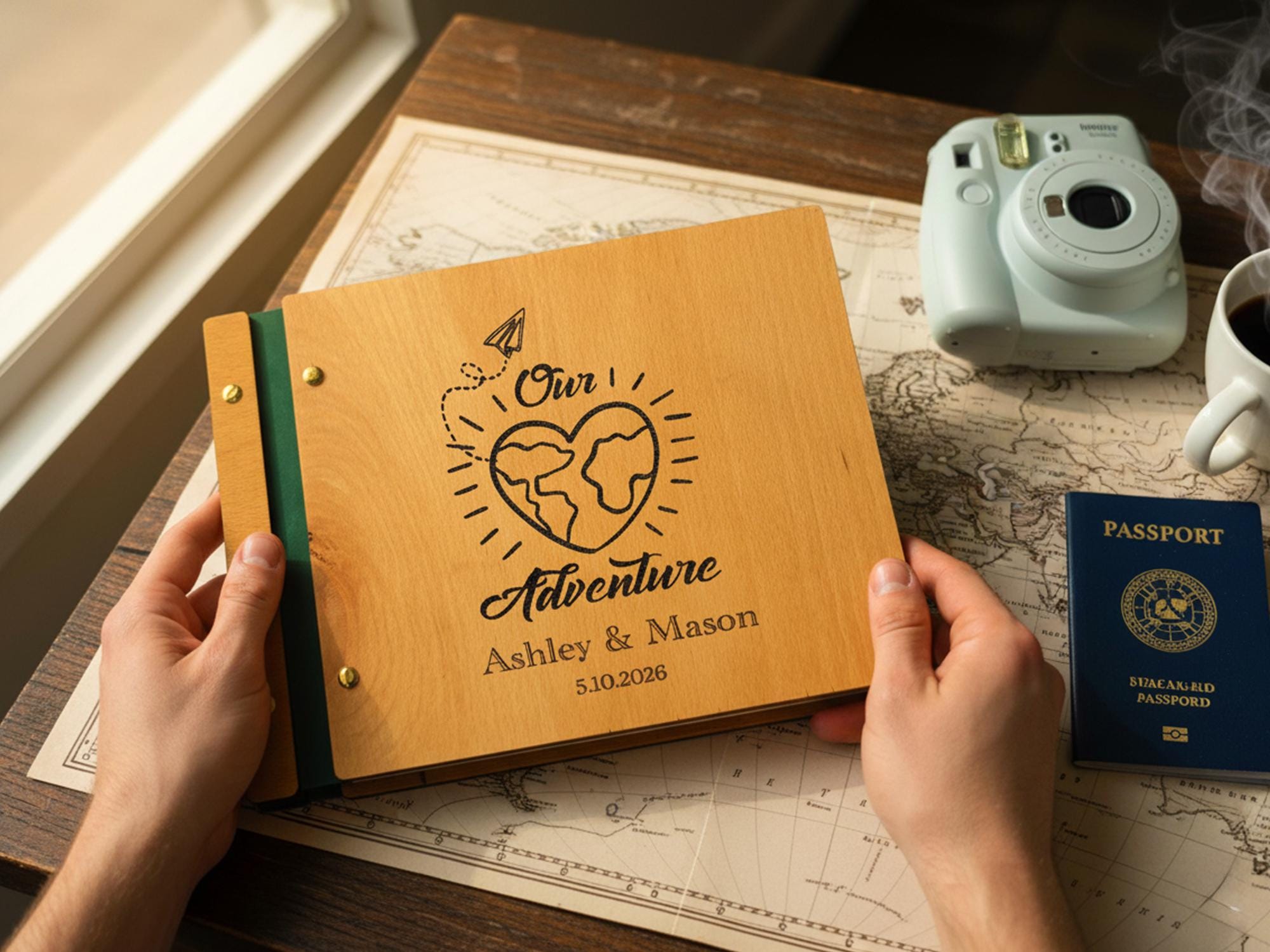 Charming Design: Features the beloved “Our Adventure” text with a heart globe and paper airplane, customized with your names and date. ❤️