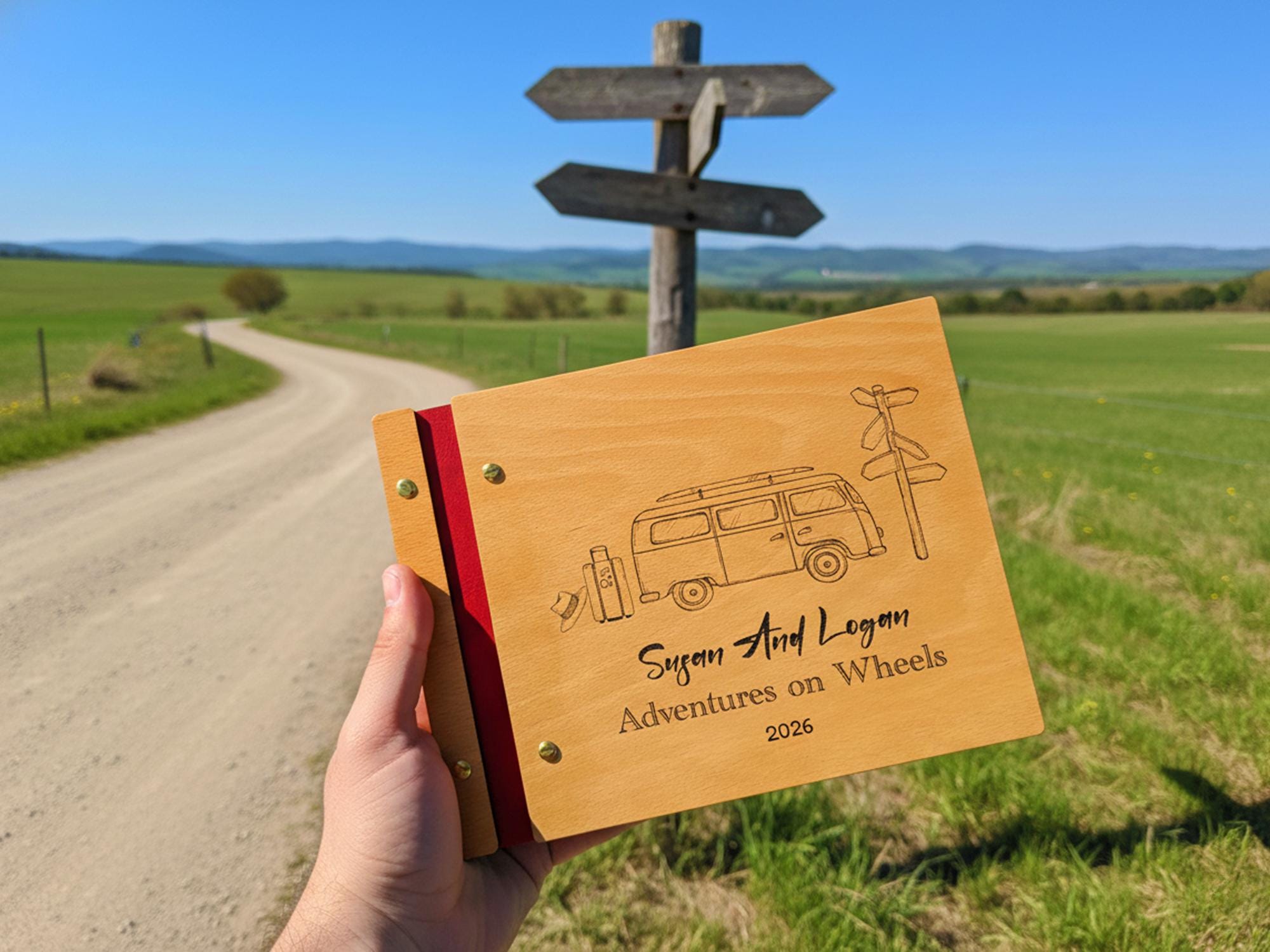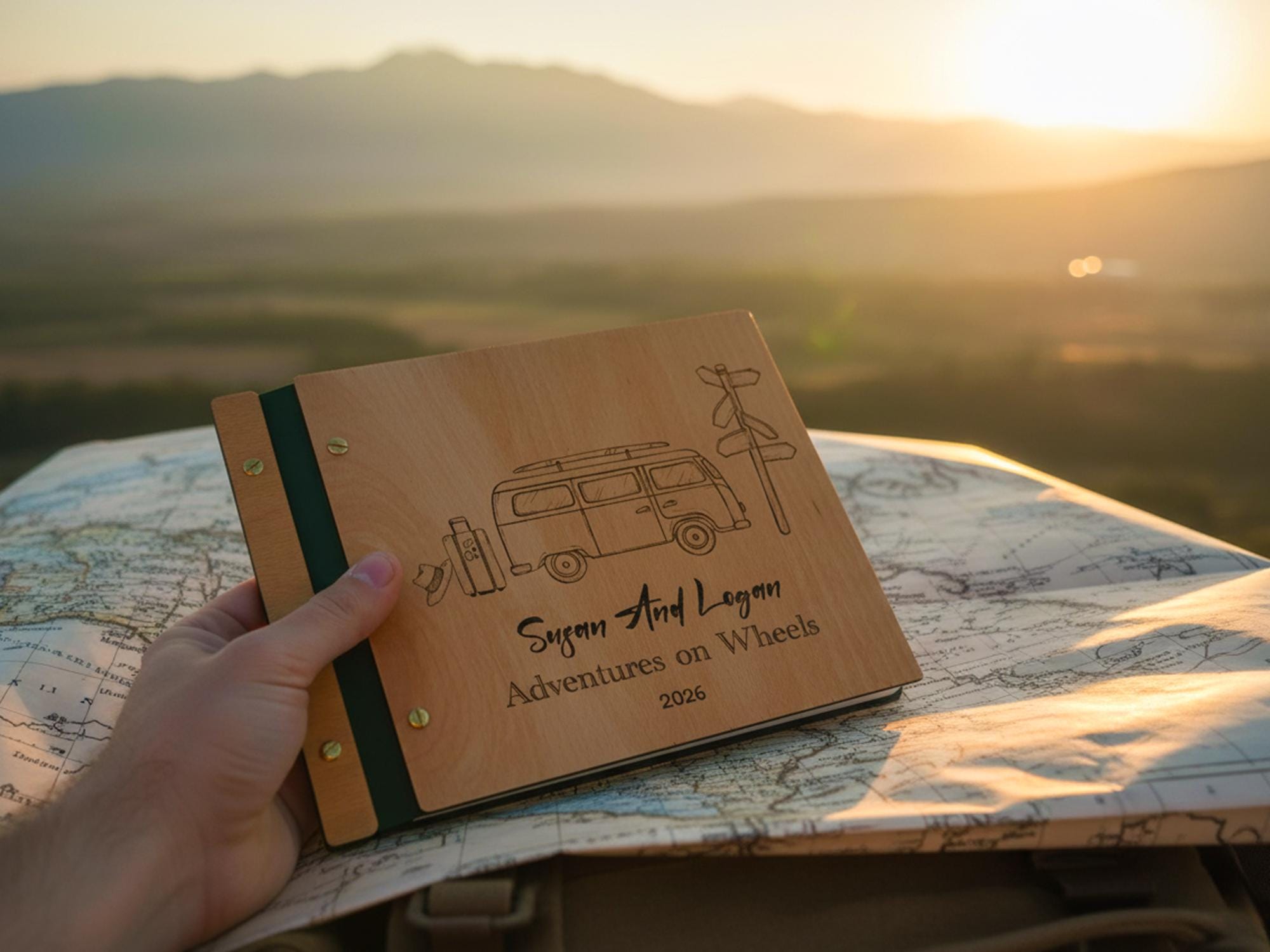 Hit the highway and log your travels with this classic “Adventures on Wheels” road trip journal. Handmade with a solid wooden cover (from natural Birch or Beech) and a genuine leather spine, this photo album is the perfect logbook for your cross-country journeys. It features a beautifully sketched, laser-engraved retro van (VW bus style) ready for an adventure. 🚐🛣️