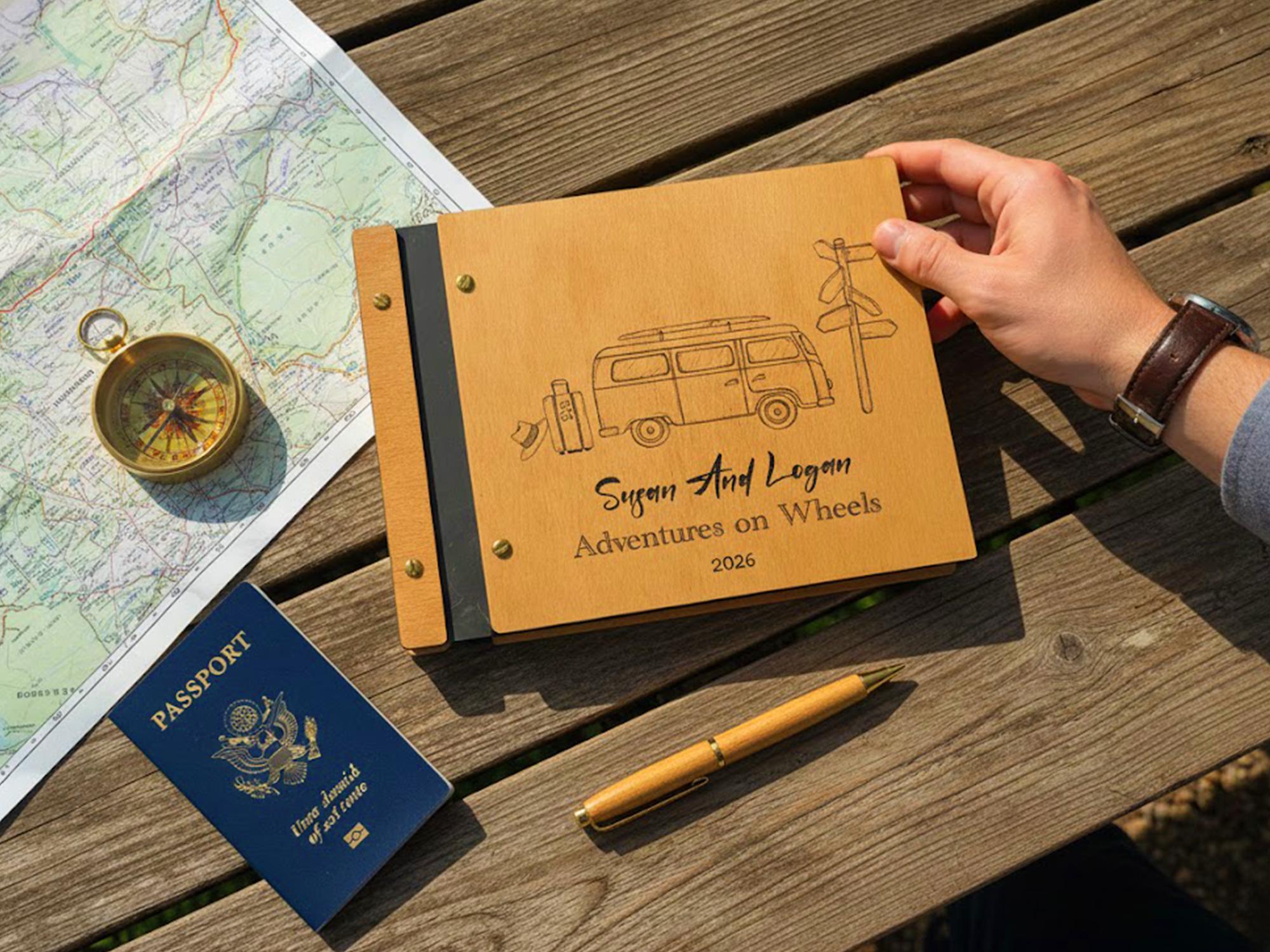 Ideal for road trippers, van life couples, or anyone with a wandering spirit, this customizable scrapbook can hold photos, maps, journal entries, and mementos from your travels.