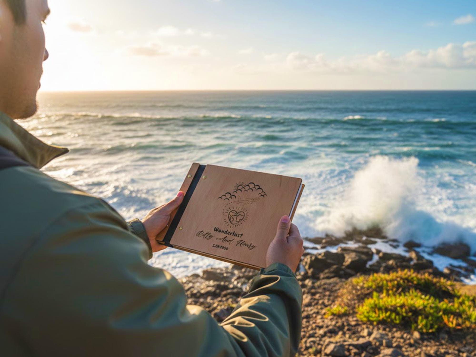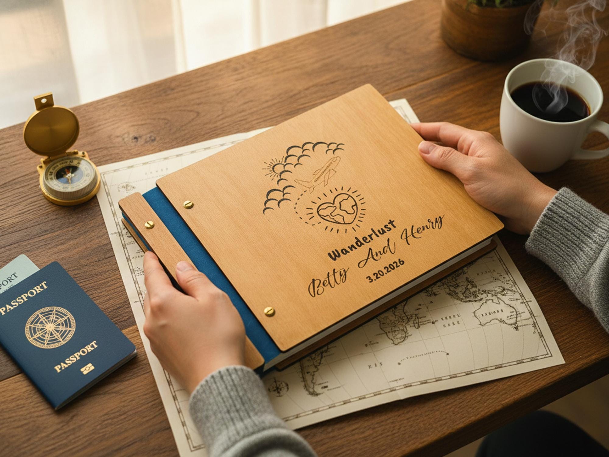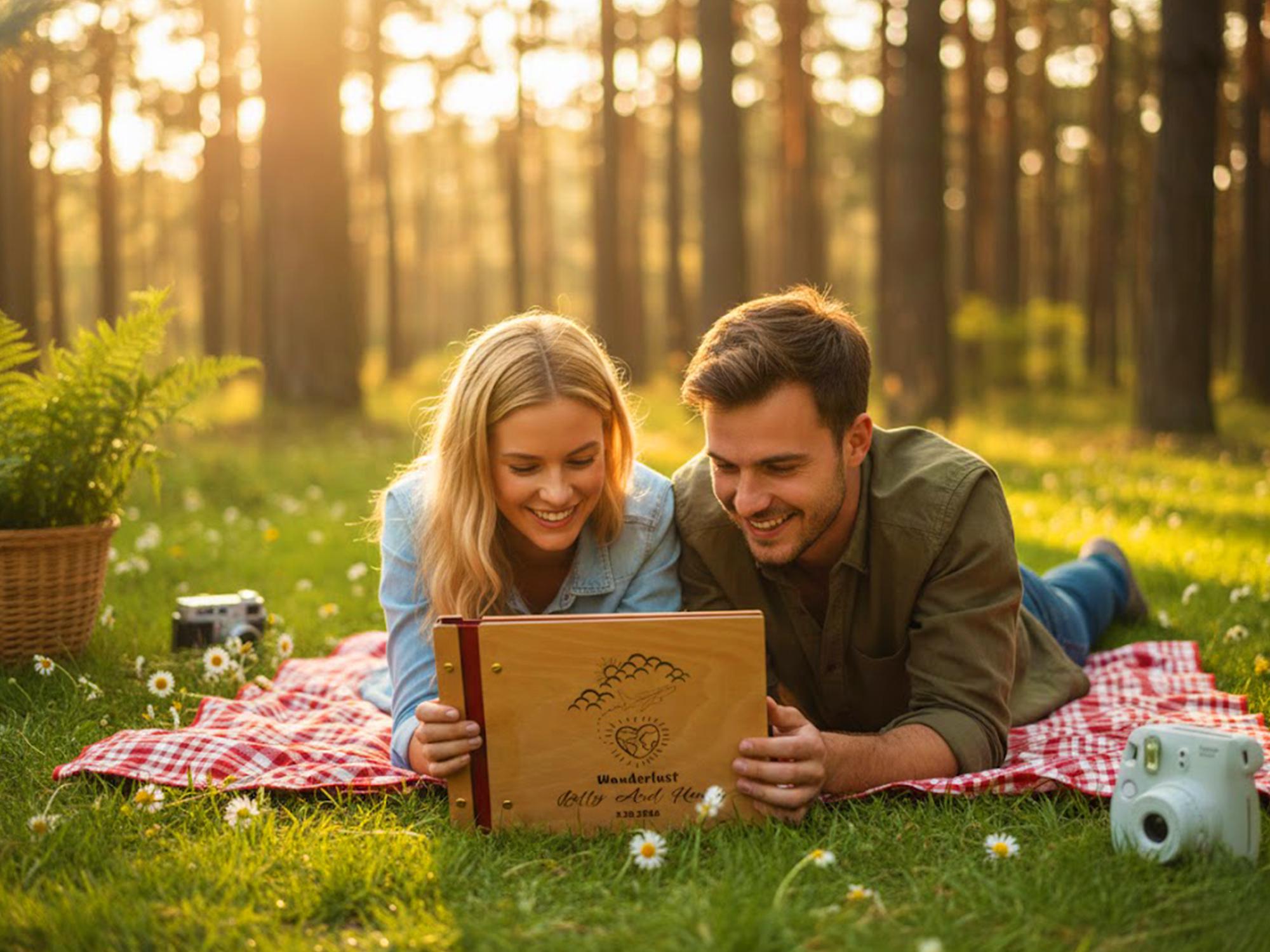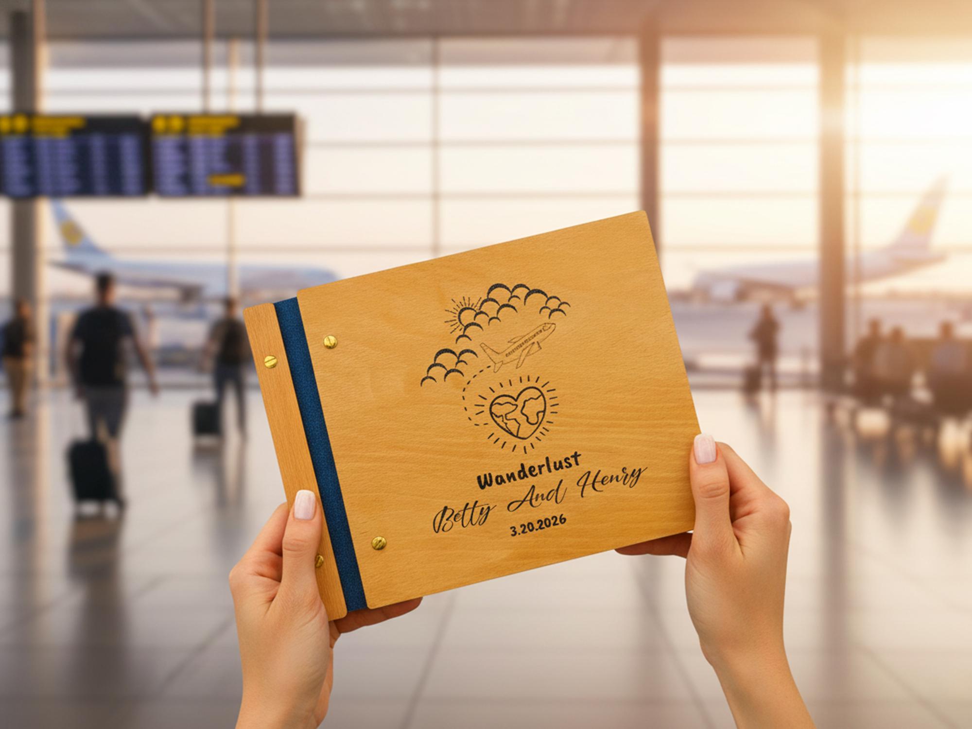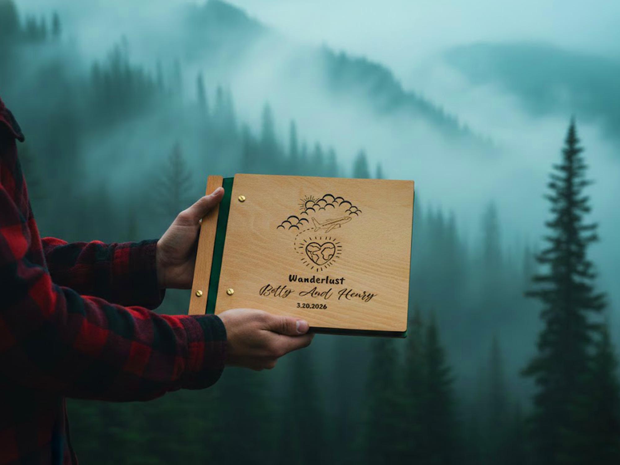 Set out on new journeys and capture your global love story with this “Wanderlust” Adventure Book. Handmade with a solid wooden cover (from natural Birch or Beech) and a durable spine, this photo album features a charming laser-engraved design of an airplane flying from the clouds to a heart-shaped globe — symbolizing your love for adventure and each other. ✈️❤️🌍