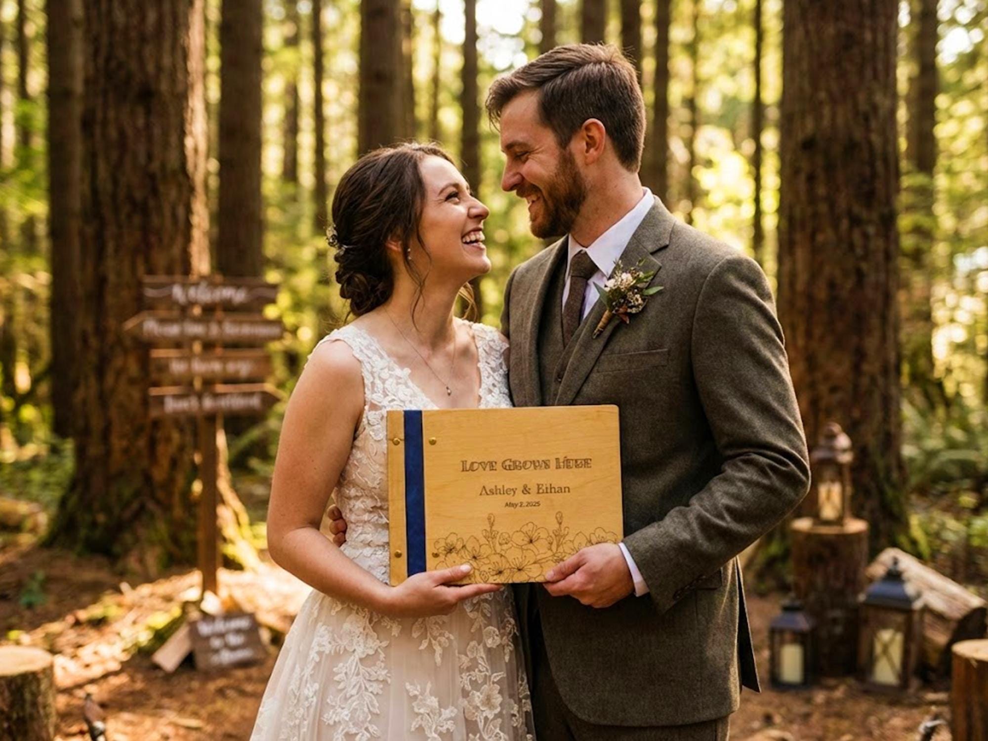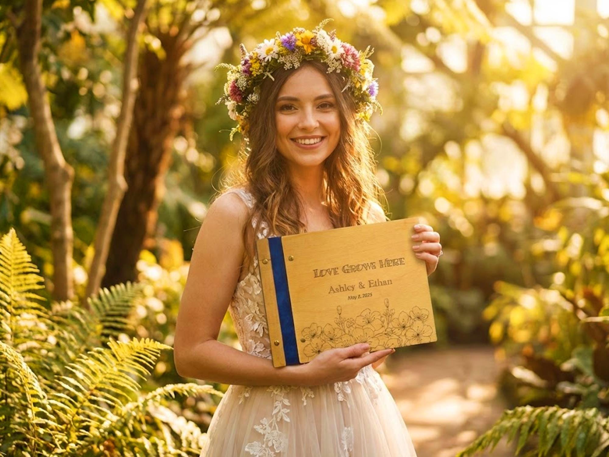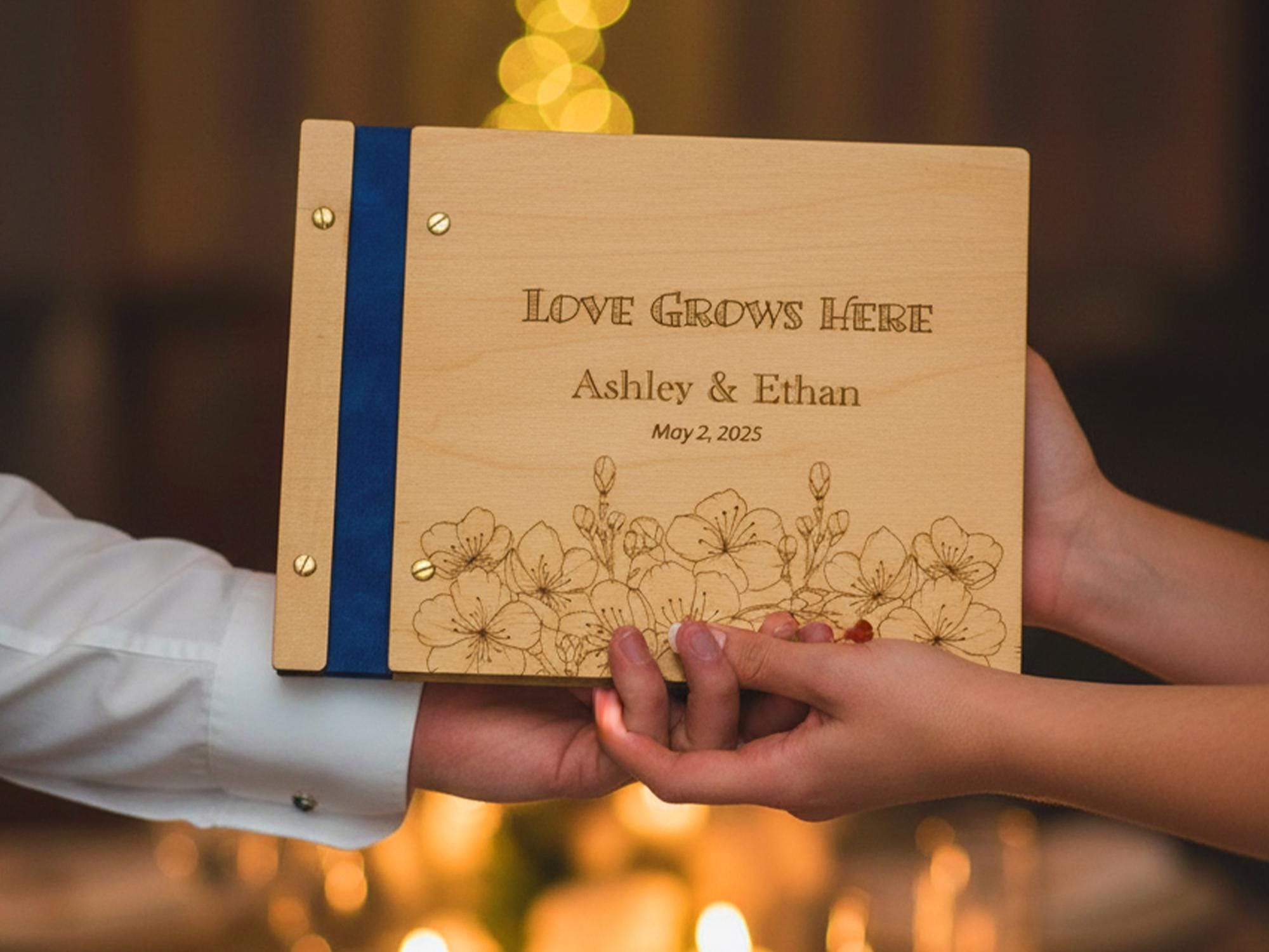 Capture the love and memories of your special day with this handcrafted wooden wedding guest book. Featuring engraved floral details and your personalized names and date, this rustic keepsake is perf…