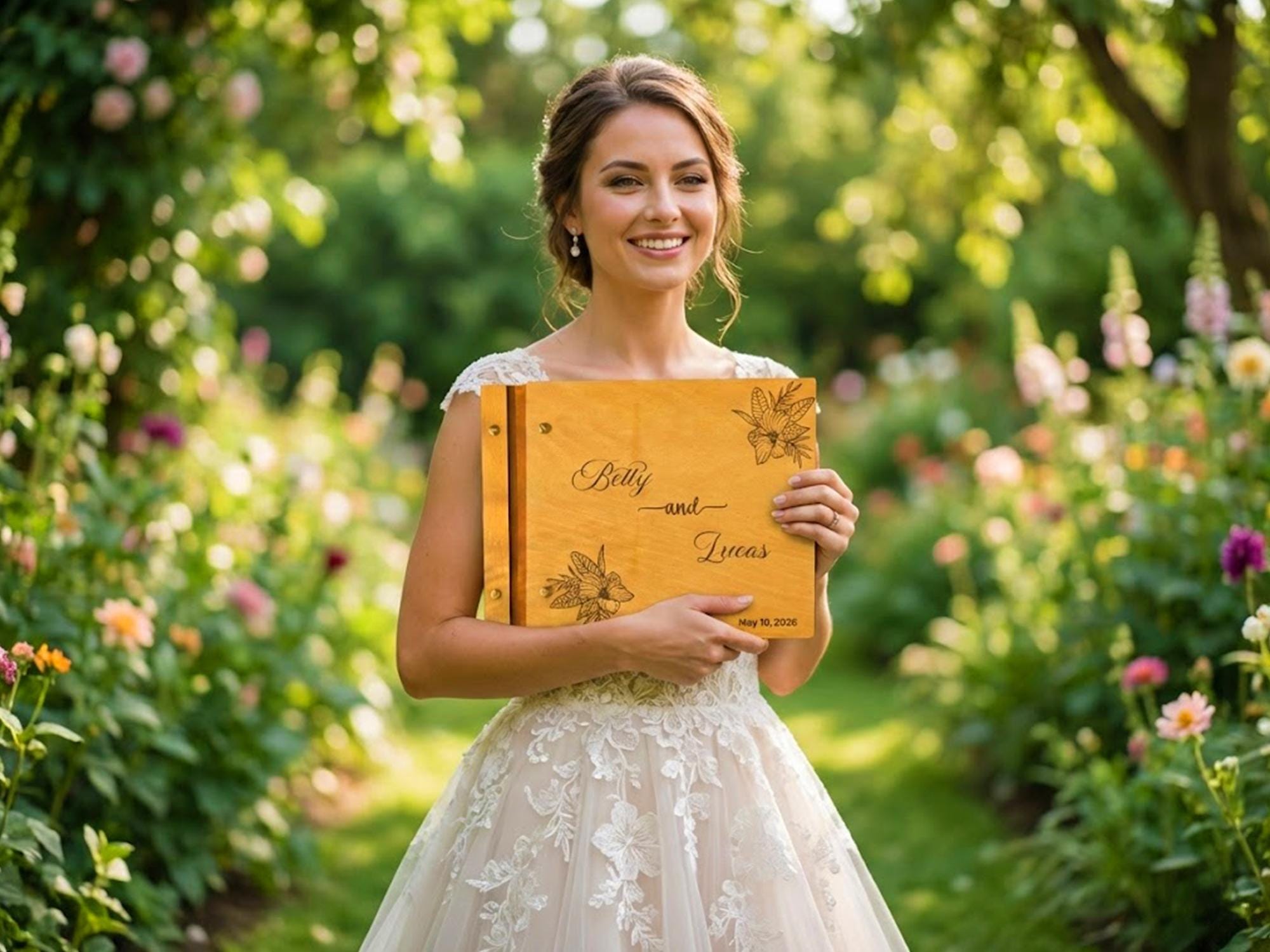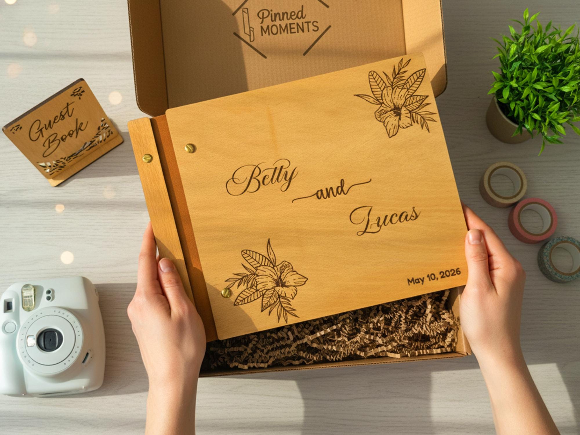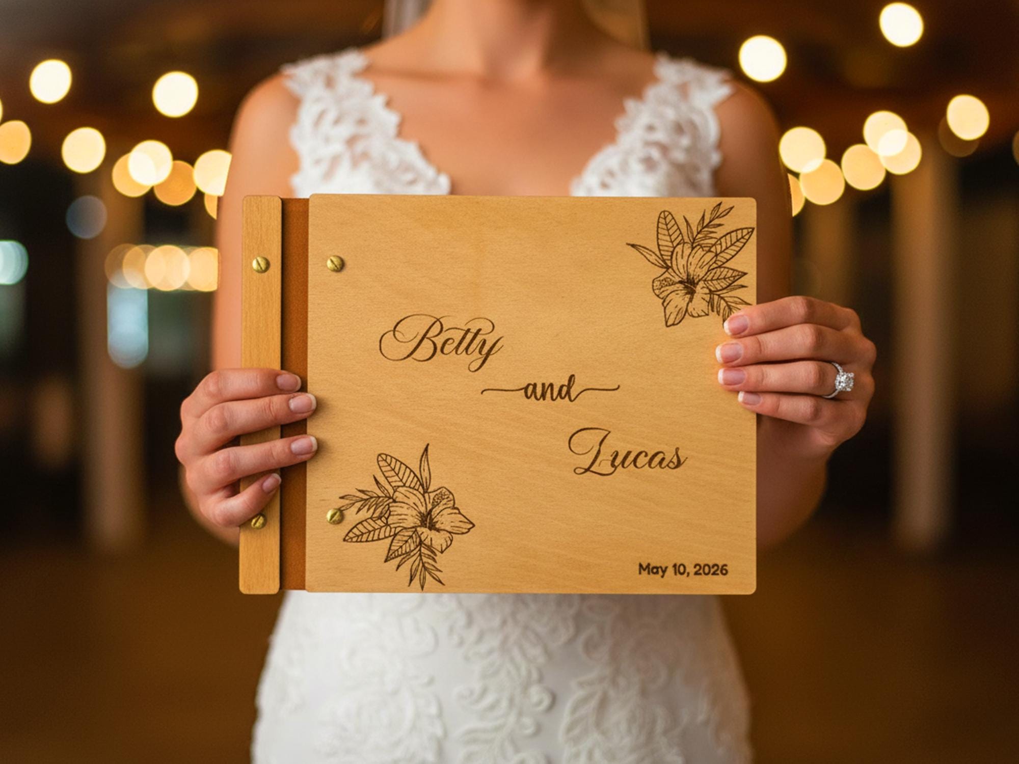 Capture the love and memories of your special day with this handcrafted wooden wedding guest book. Featuring engraved floral details and your personalized names and date, this rustic keepsake is perf…