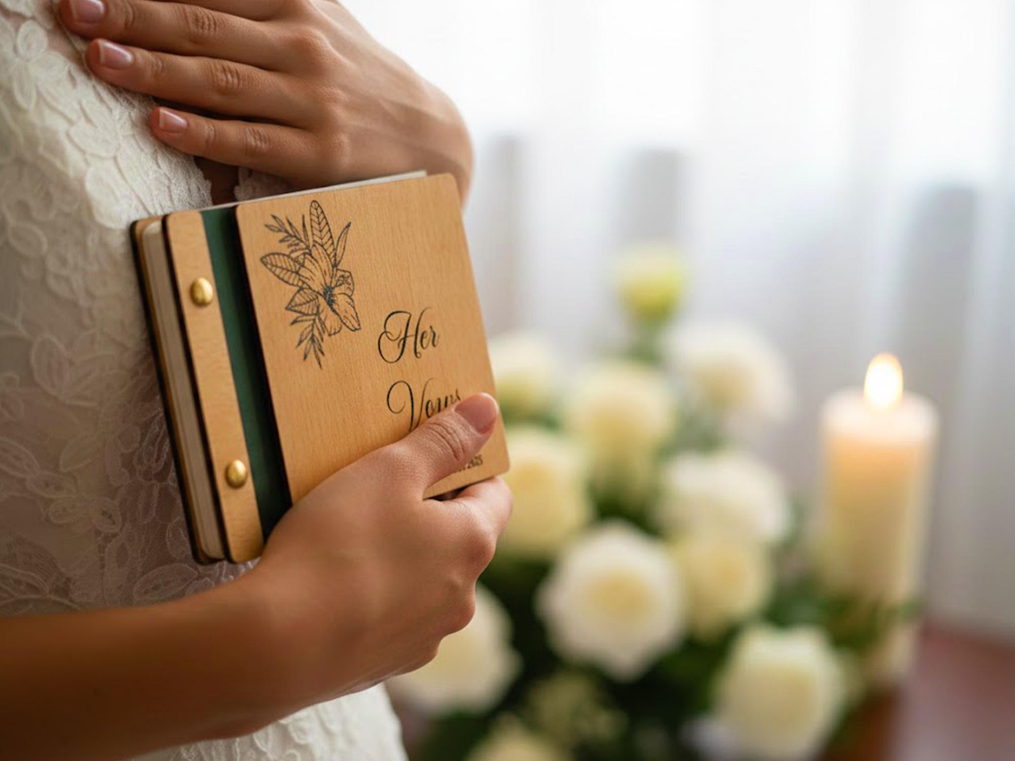 Capture your sacred wedding promises in a keepsake as beautiful as your destination. Our handcrafted wooden vow books feature a stunning, laser-engraved tropical hibiscus flower, paired with an elegant script font.