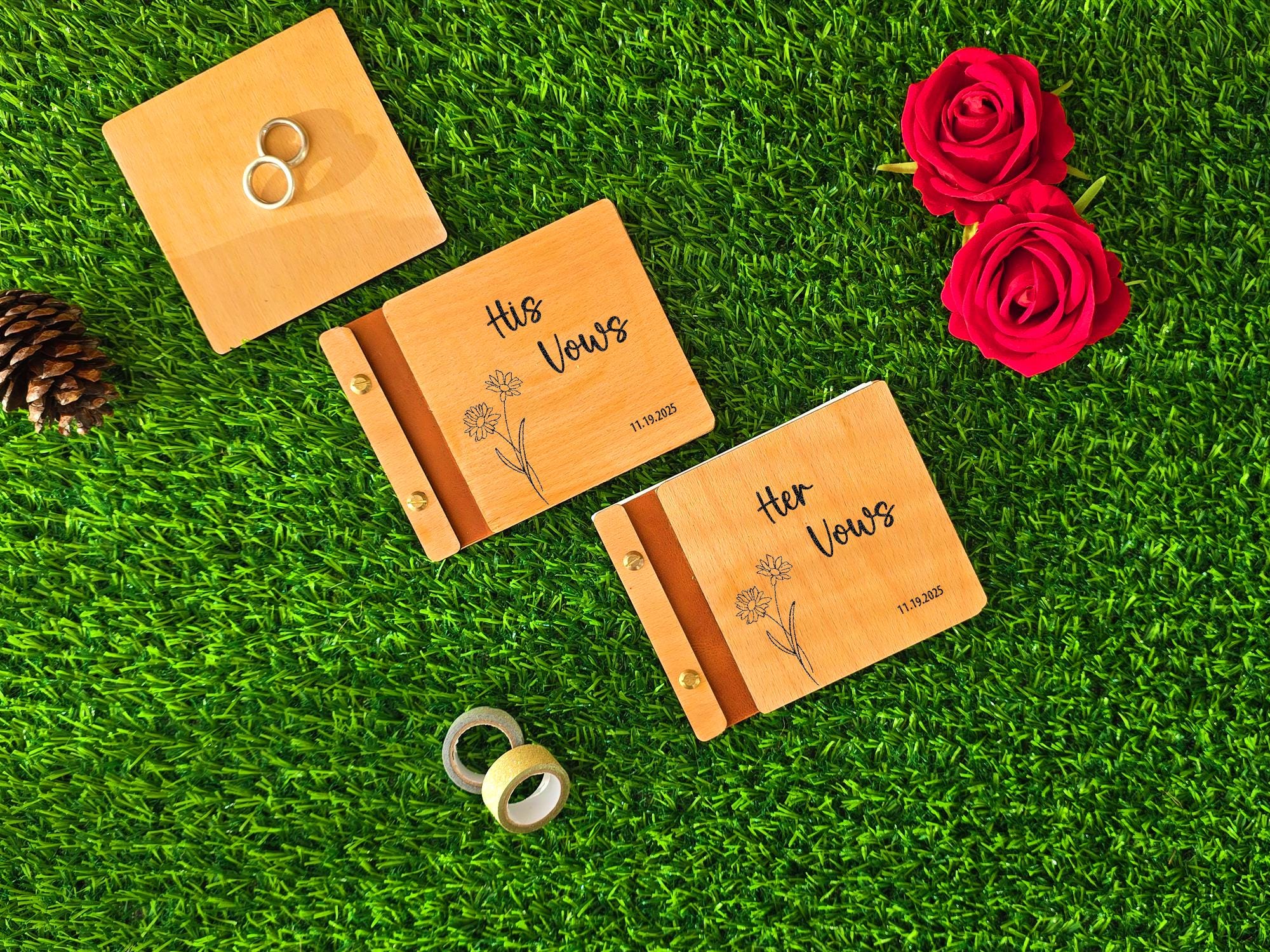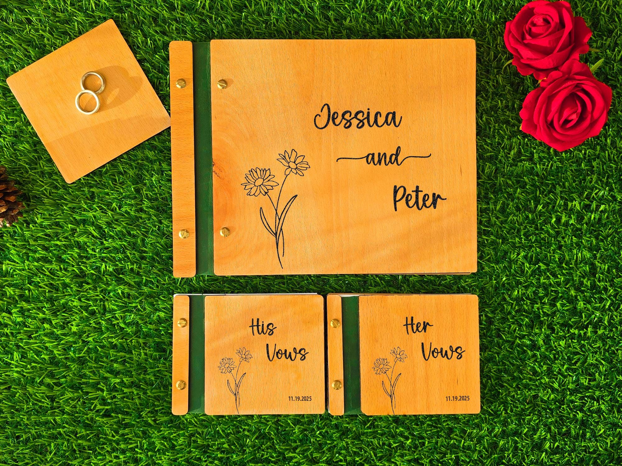 Hold your wedding promises in a book as beautiful as your love story. Our handcrafted wooden vow books feature a delicate, laser-engraved wildflower (daisy) design, perfect for any rustic, boho, or g…